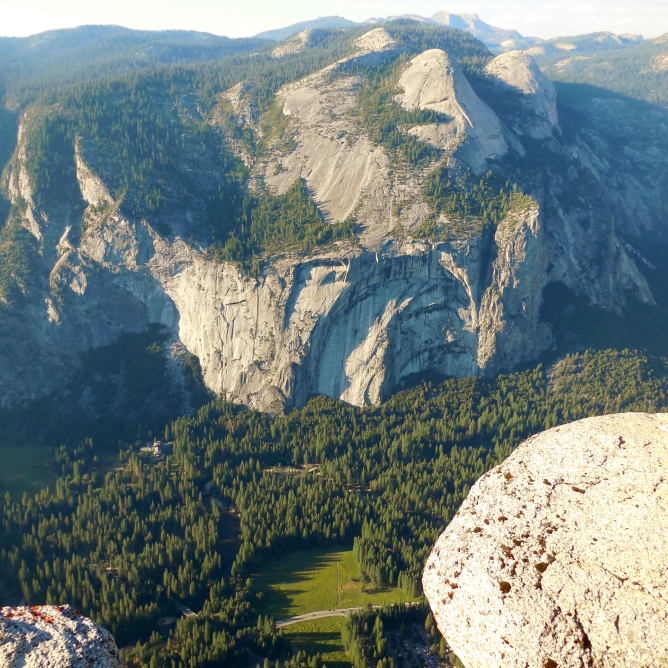 We took the winding road for miles up to Glacier Point. There was a cliff on one side with no guardrail and a wall of rocks on the other side. It was nothing but switchbacks as we slowly climbed the mountain. The top was over 7,000 ft in elevation. Finally, it was cooler. Yosemite Valley had a temperature of 104º F. The view was beautiful. You could literally see for miles. You could see three waterfalls, Yosemite Falls, Vernal Falls, and Nevada Falls. There were also views of El Capitan and Half Dome. If you looked through the binoculars provided on the stone wall at the overlook, there was actually a row of a few people scaling the top curve of Half Dome.